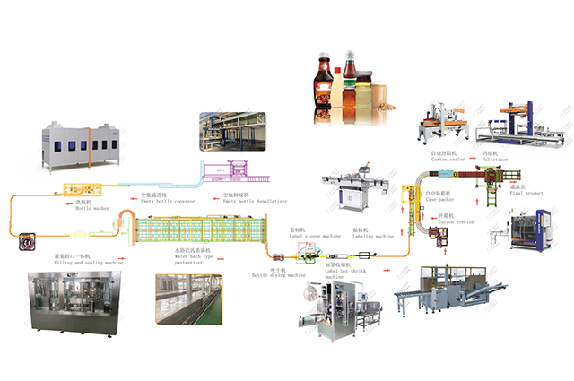空瓶卸垛——洗瓶——自動濃醬灌裝機(jī)——玻璃瓶封口機(jī)——?dú)⒕鷻C(jī)——套標(biāo)機(jī)——貼標(biāo)機(jī)——開箱機(jī)——裝箱機(jī)——封箱機(jī)——碼垛機(jī)