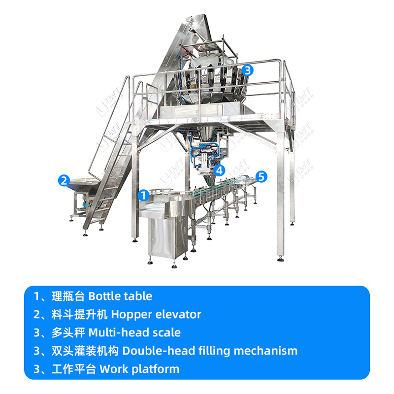 多頭秤灌裝機尼為機械顆粒鹽多頭秤灌裝機,是一款針對顆粒鹽物料特性研發(fā)的自動固型灌裝設備。該設備可全程自動化完成顆粒鹽的自動計量、定量送料、精準裝罐、成品輸送等全套包裝流程,無需人工過多干預,大幅提升生產線自動化水平。機身整體采用食品級SUS304不銹鋼打造,不僅外觀美觀大方,更能滿足鹽業(yè)生產要求,確保顆粒鹽在包裝過程中不受污染,設備制造精良、操作便捷、運行穩(wěn)定,是鹽業(yè)規(guī)模化生產的理想選擇。