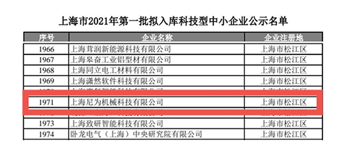 近日,根據(jù)《科技型中小企業(yè)評(píng)價(jià)辦法》,上海尼為機(jī)械科技有限公司被認(rèn)定為上海市2021年第1批擬入庫(kù)科技型中小企業(yè)。這是我司在科技創(chuàng)新型企業(yè)發(fā)展道路上取得的喜人成果,是有關(guān)部門給予我司研發(fā)和創(chuàng)新能力的認(rèn)可。