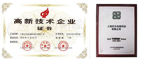 憑借過硬的創(chuàng)新能力和研發(fā)能力,上海尼為機(jī)械科技有限公司先后被評(píng)為“高新技術(shù)企業(yè)”、“專精 特新” 、“科技型中小企業(yè)”,見證了我司科技創(chuàng)新的雄厚實(shí)力。